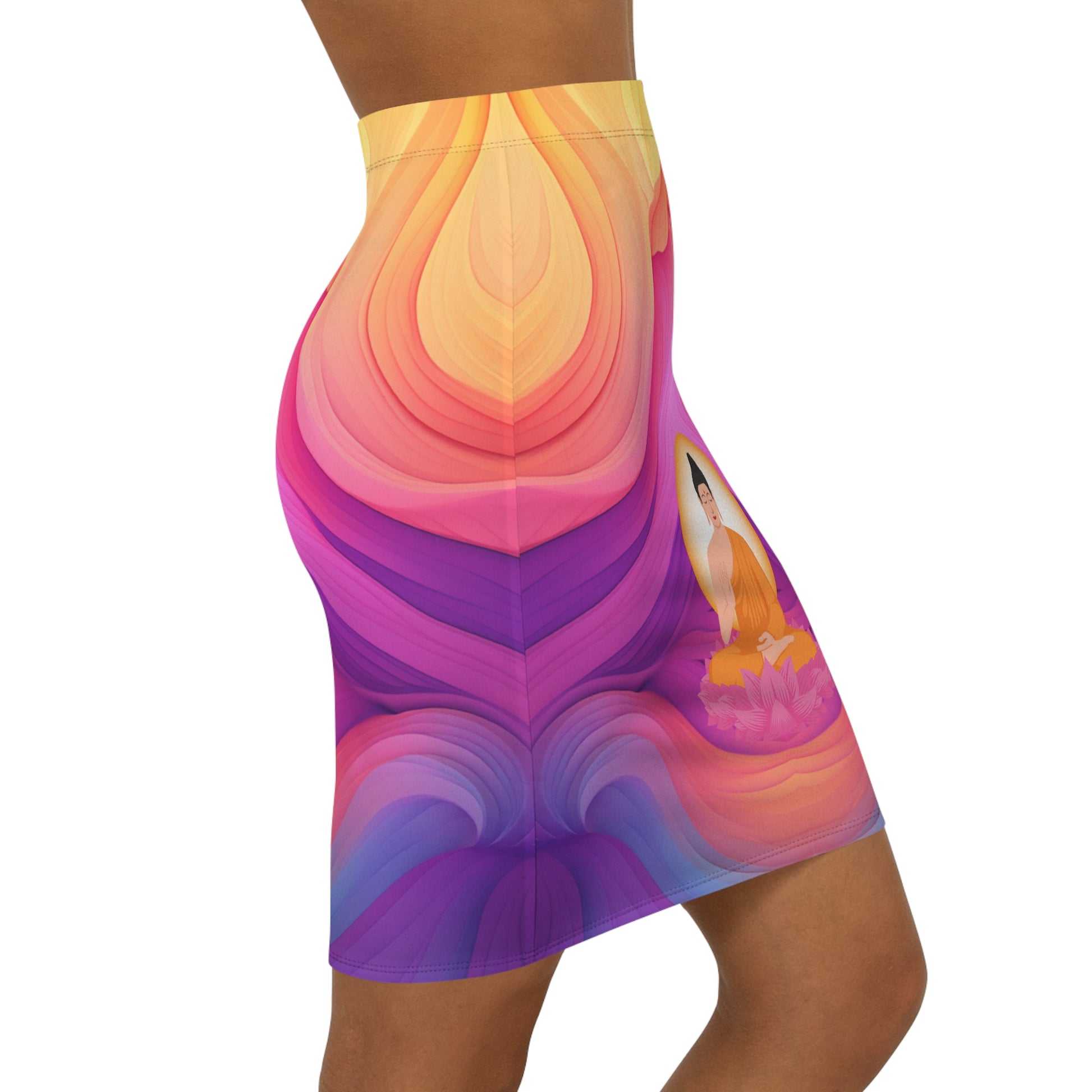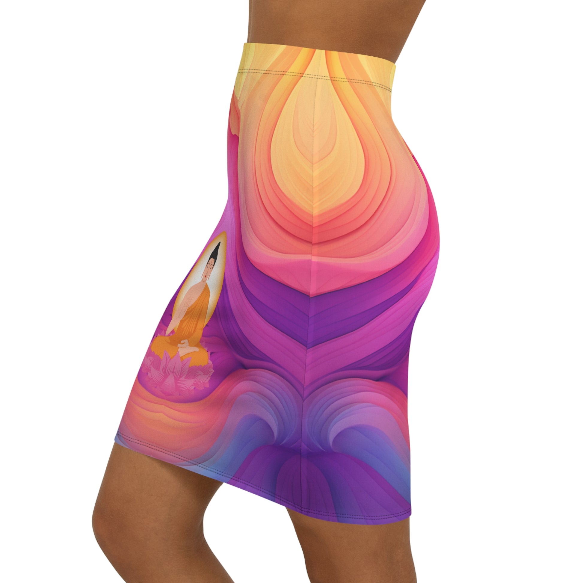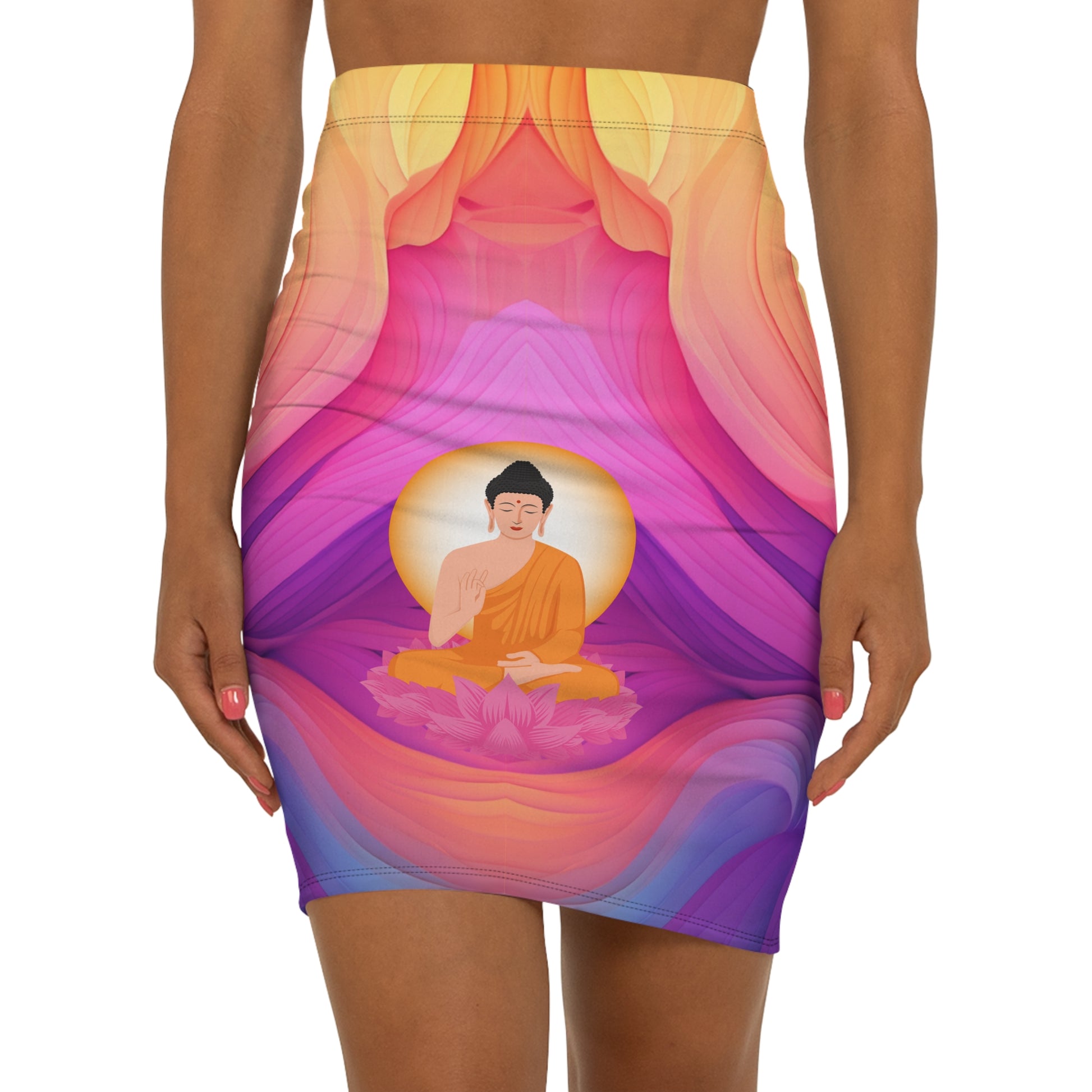 Ein Rock, der mehr ist als Mode: Der „Kaleidoskop“-Rock kombiniert leuchtende Farben mit spiritueller Symbolik. Inmitten fließender Formen und lebendiger Farbverläufe thront ein meditierender Buddha auf einer Lotusblüte – ein Symbol für Ruhe, Klarheit und Transformation.